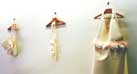 Los nidos representan, para la artista, las múltiples y diferentes relaciones que se establecen entre una madre y su criatura. Nidos -objetos y dibujos- que rompen ese ideal maternal artificial, unívoco y culposo según el cual la madre sería siempre igual: dispuesta, abnegada, una prolongación de las necesidades de su hijo o hija. Partiendo del carácter relacional de la experiencia materna, la artista da cuenta de esa multiplicidad: relaciones afiladas, hirientes; relaciones que curan; relaciones heladas, calculadas; relaciones físicas, entrañables; relaciones que abren o cierran puertas; relaciones que conectan; ... La autora insiste en que no se trata de atribuir a cada experiencia materna un tipo de relación de por vida, sino que son, todas ellas, diferentes estados de ánimo, momentos, etapas por las que discurre la aventura del reconocimiento entre una madre y la singular persona que ha traído al mundo. Relaciones, como muestran las fotografías, que circulan entre el pensamiento y las entrañas, deshaciendo la falsa oposición jerarquizada entre mente y cuerpo, integrando razón y sentimientos en un continuo. Continuidad que abre las puertas al mundo, a la cultura y la sociedad, alejando al hecho materno de esa construcción biológica, muda y meramente instintiva en la que demasiado a menudo se lo ha querido encerrar. Lecturas y reflexiones que Mónika ha utilizado para su trabajo, inciden en la historicidad del sentimiento materno, en cómo en diferentes coordenadas espaciales y temporales se han atribuido a la maternidad muy distintos valores y actitudes. Esther Moreno (del texto del catálogo)